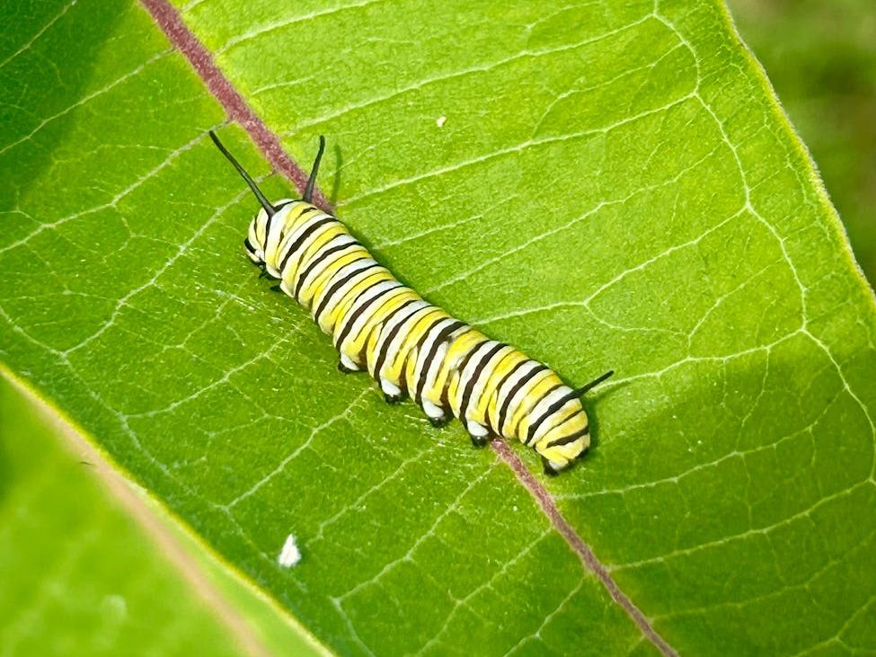 - After hatching, the tiny black-and-white-striped caterpillars begin feeding on milkweed leaves.
